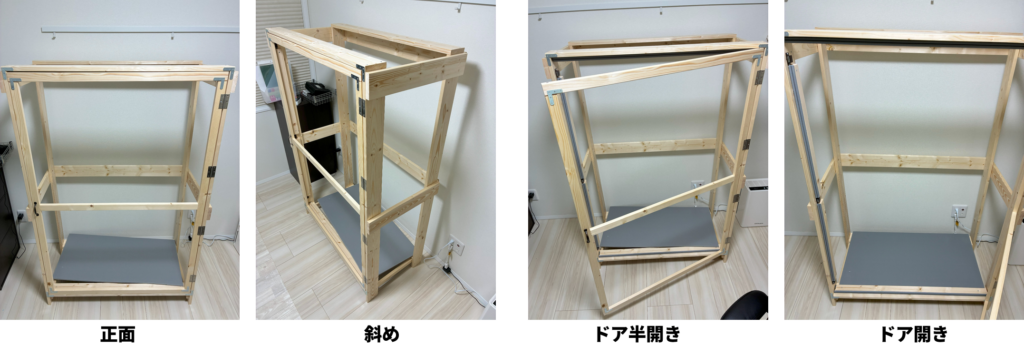 前回の記事では、資材の選定についてまとめましたが、今回はその資材を実際に組み立てていく工程です。写真の枚数が多く、記事が長くなりそうなので「前編」としてフレーム本体の構築までを記録します。ドアの組み立てや細かい仕上げ工程は次回の「後編」でまとめる予定です。
