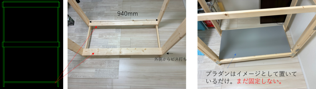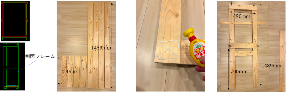 側面フレームの内側、下の方に1×2材(490mm)を1本取り付けました。