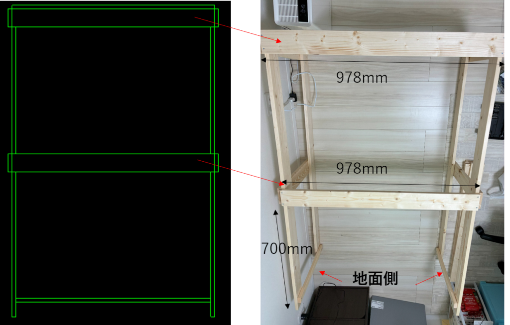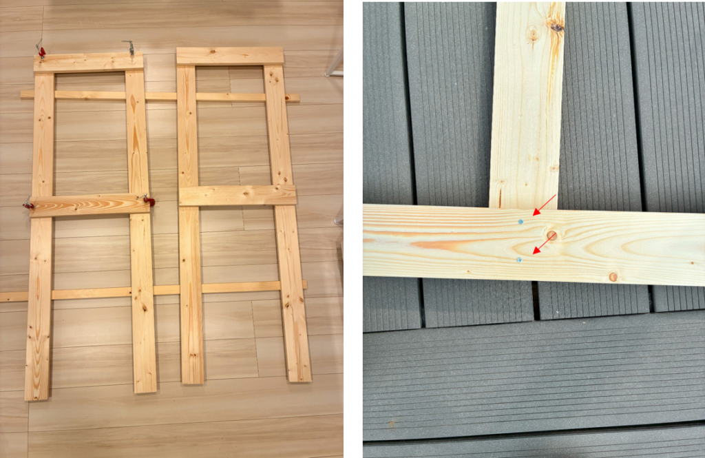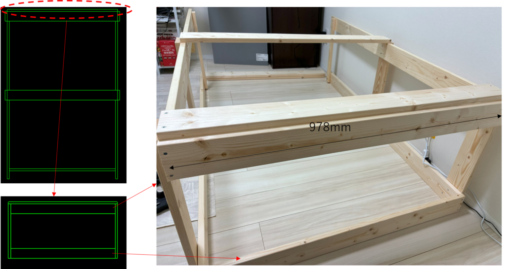 このフレーム全体の設計は、「できるだけ木材どうしの角を合わせて固定するだけで完成する」ことを意識しています。長さを測らないといけない箇所は極力減らし、測る必要がある部分も、多少位置がずれても問題が出ないように余裕を持たせています。