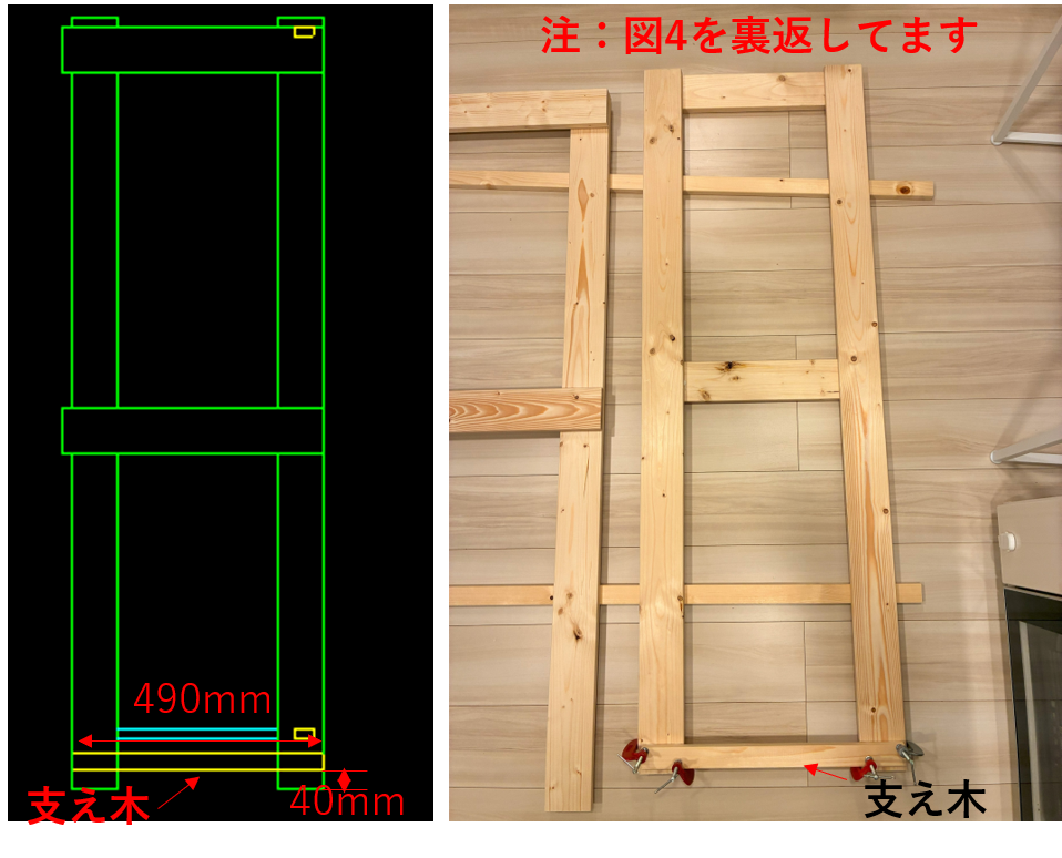 取り付け位置は設計図どおり、支え木の下面が床面から40mmになるように固定しました。