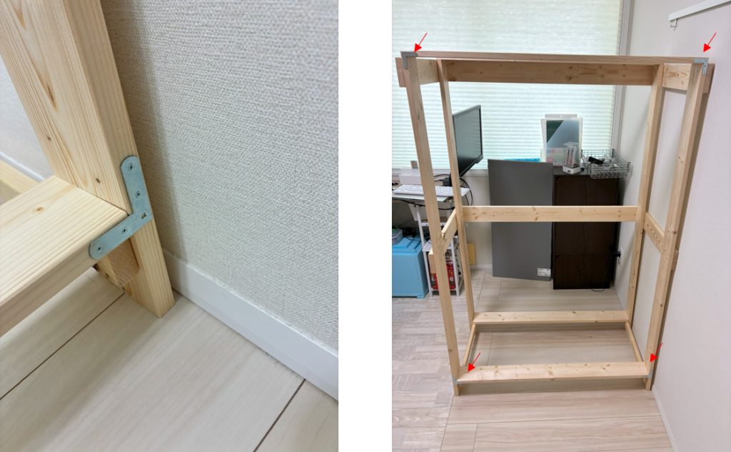 ここまででも構造的には安定してきましたが、正面側は横方向の支えになる木材が少ないため、4隅をLプレートで補強しています。